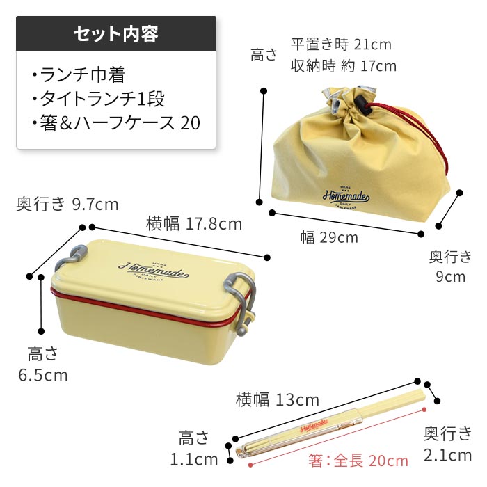 Detail 詳細 Color カラー Size サイズ サイズ タイトランチ1段:約 幅 17.8 × 奥行き 9.7 × 高さ 6.5cm お箸:箸 全長 20cm / ケース 約 幅 13 × 奥行き 2.1 × 高さ 1.1cm 巾着:平置き時:約 幅 29 × 奥行き 9 × 高さ21cm お弁当箱収納時:約 幅 20 × 奥行き 9 × 高さ 17cm 素材 タイトランチ1段:飽和ポリエステル樹脂・ABS樹脂・ポリプロピレン・シリコン お箸:AS樹脂・ABS樹脂 巾着:表地 綿100% / 裏地 ポリエステル100% 容量 500ml 旧製品からの仕様変更点 2021年12月までのモデルの仕様 ・抗菌加工なし ・本体デザイン サブヒロモリ シリーズ はこちら お弁当グッズ特集 はこちら ギフトバッグラッピングは こちら キッチン総合 ランキング