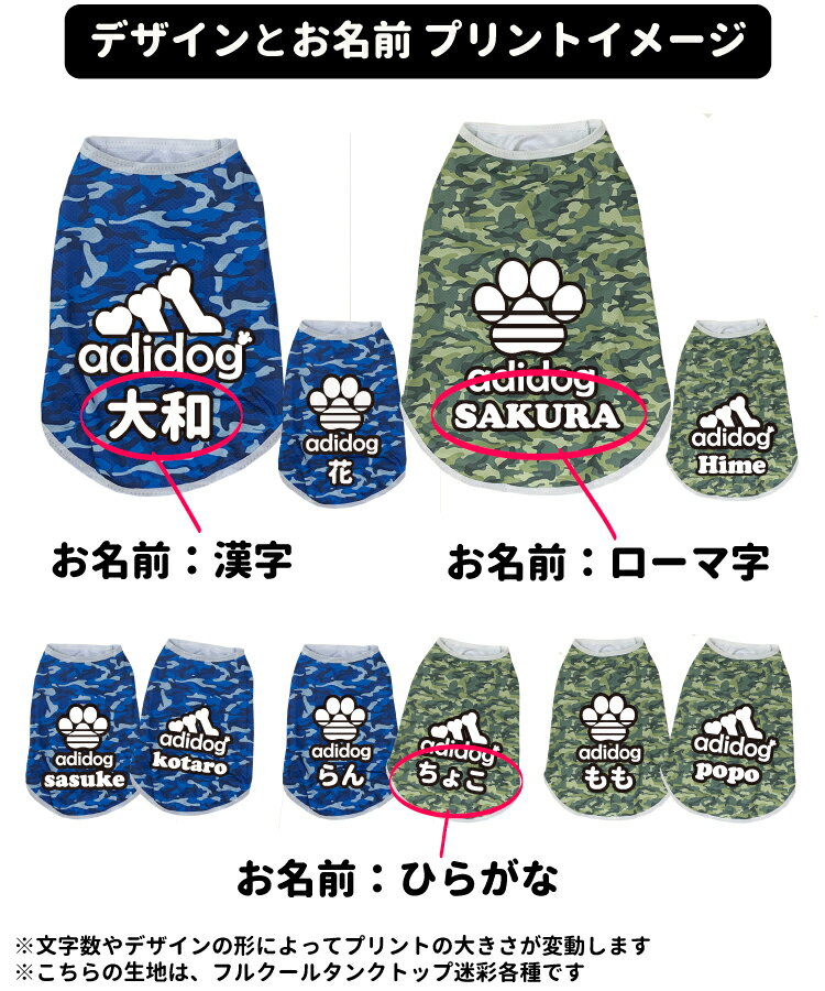 ◇無地タンクトップ ◇迷彩タンクトップ 2~4号 2~4号 5~7号 5~7号 8~10号 8~10号 人気のアディドッグデザインが、2種類になりました!! さらにお名前も入って、大人気フルクール商品のオプションとして新しく登場です!! 2色の迷彩柄フルクールメッシュタンクトップ×2種のアディドッグデザインがかわいい♪