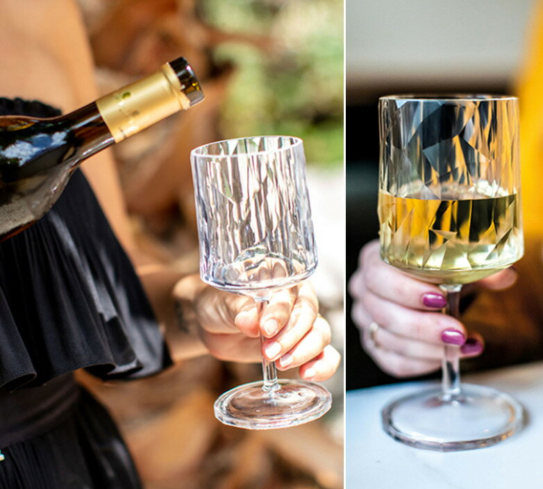 本物のガラスのようなカッティングデザインのグラスは、車の中や、キャンプ、お庭での食事などアウトドアでも大活躍します。